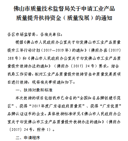 佛山市人民政府办公室关于印发佛山市工业产品质量提升扶持办法的通知