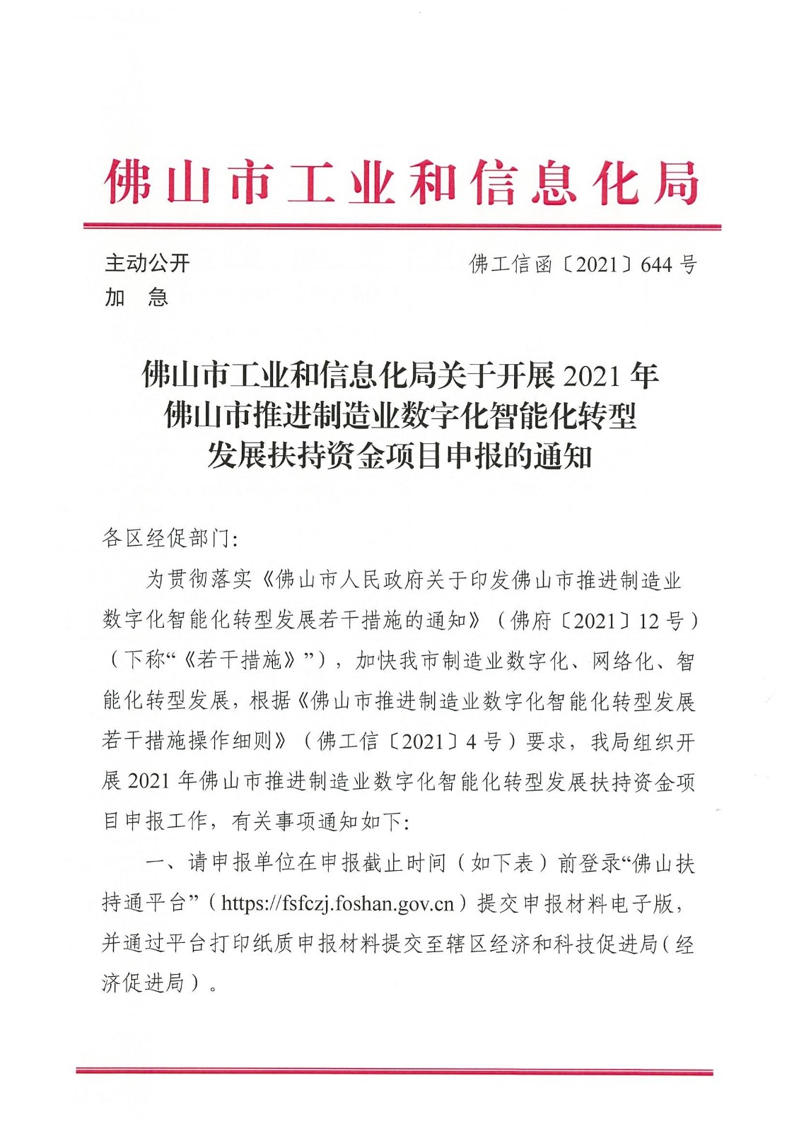 关于开展2021年佛山市推进制造业数字化智能化转型发展扶持资金项目申报的通知