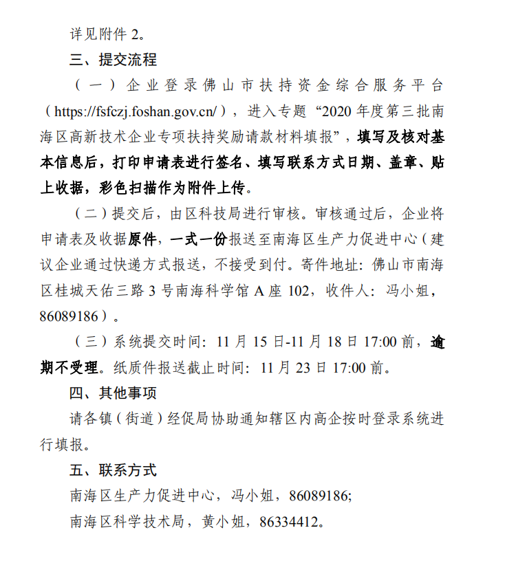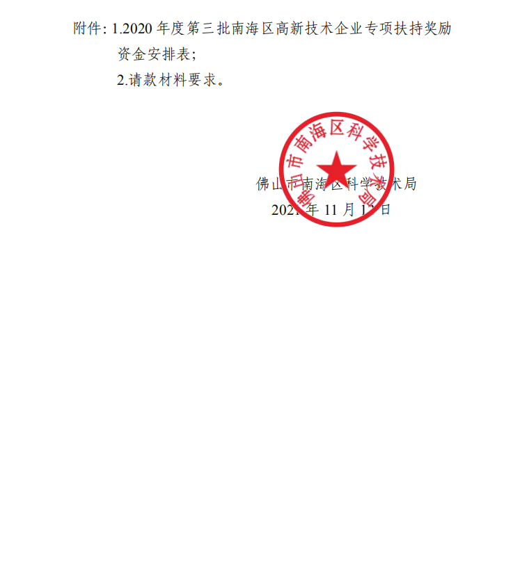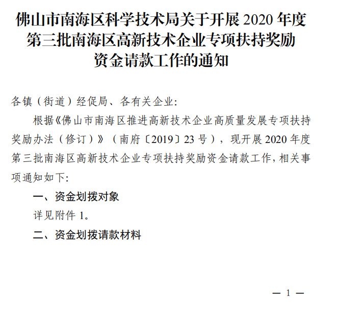 关于开展2020年度第三批南海区高新技术企业专项扶持奖励资金请款工作的通知