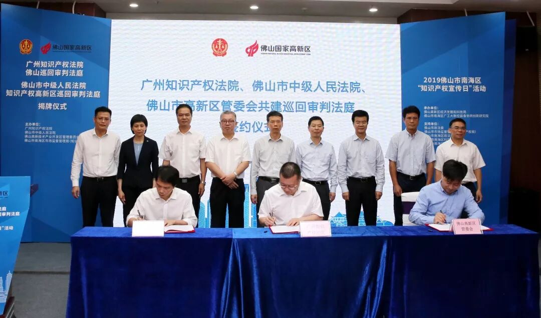 ▲广州知识产权法院、佛山市中级人民法院、佛山高新技术产业开发区管理委员会三方共同签署关于建设巡回审判法庭的协议。