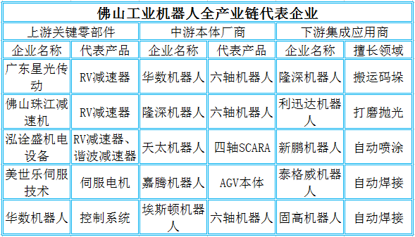 工业机器人产业链上中下游,上游是关键零部件生产厂商,主要是减速器、控制系统和伺服系统;中游是机器人本体,即机座和执行机构,部分本体还包括行走结构;下游是系统集成商,根据不同的应用场景和用途进行有针对性地系统集成和软件二次开发,大多数企业都集中在这个环节上。生产出来的机器人只有通过系统集成之后,才能投入到下游的汽车、电子、金属加工等产业,为终端客户所用。目前,佛山机器人约80%企业主要集中在下游集成应用端,上游的关键零部件仍是主要薄弱环节。