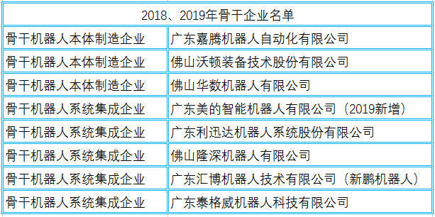 骨干类:2018年上榜的骨干机器人本体制造企业包括嘉腾机器人、沃顿装备及华数机器人3家,2019年保持上榜。而2018年的骨干机器人系统集成企业则顺德、南海各半,分别是隆深机器人、利迅达机器人、新鹏机器人及泰格威机器人,2019年增加了美的智能机器人,共5家。2019年获得的扶持资金最高约500万。