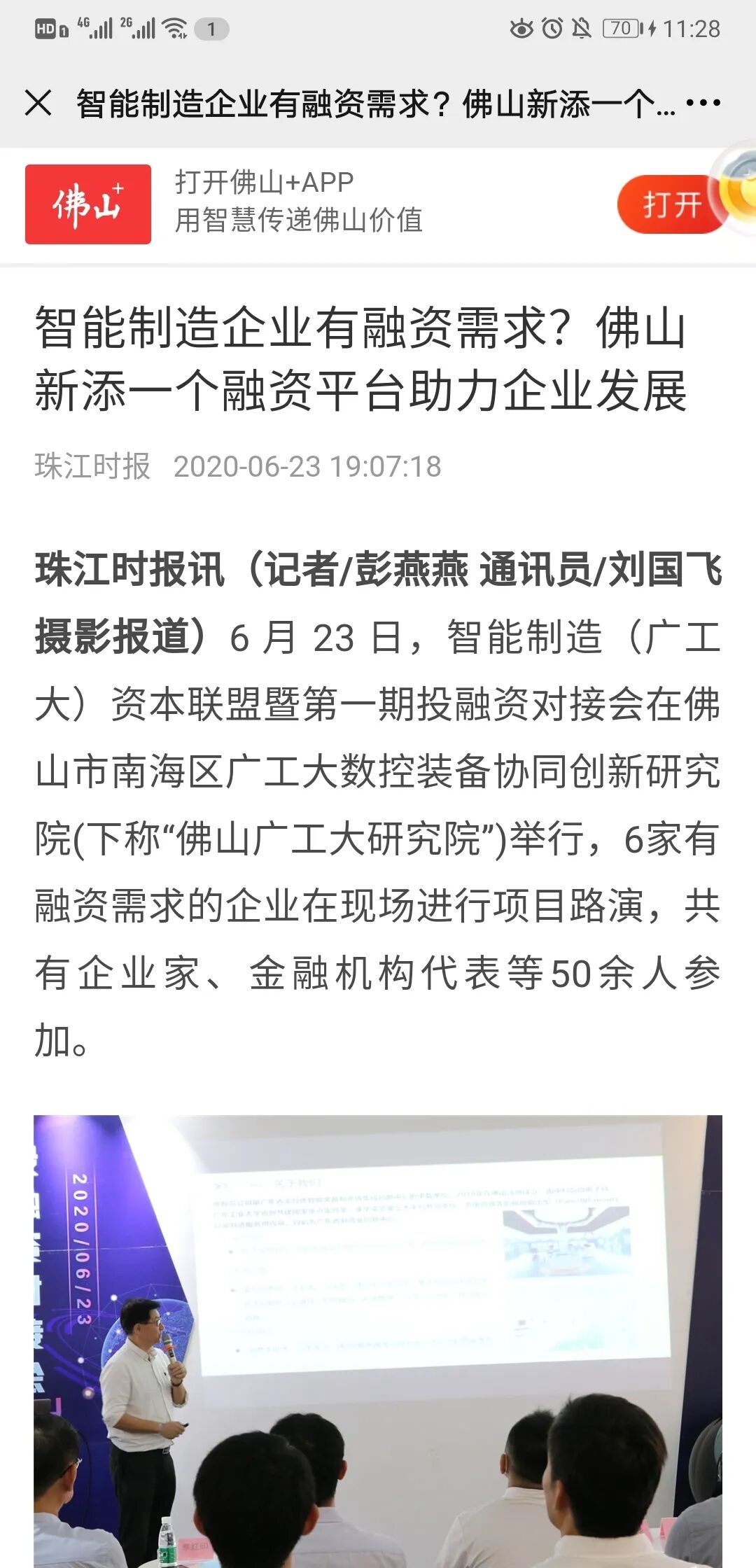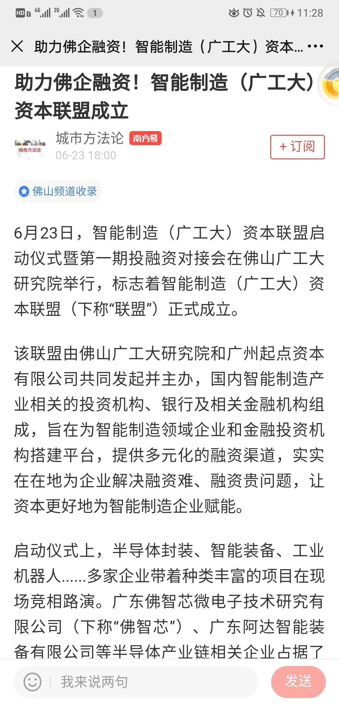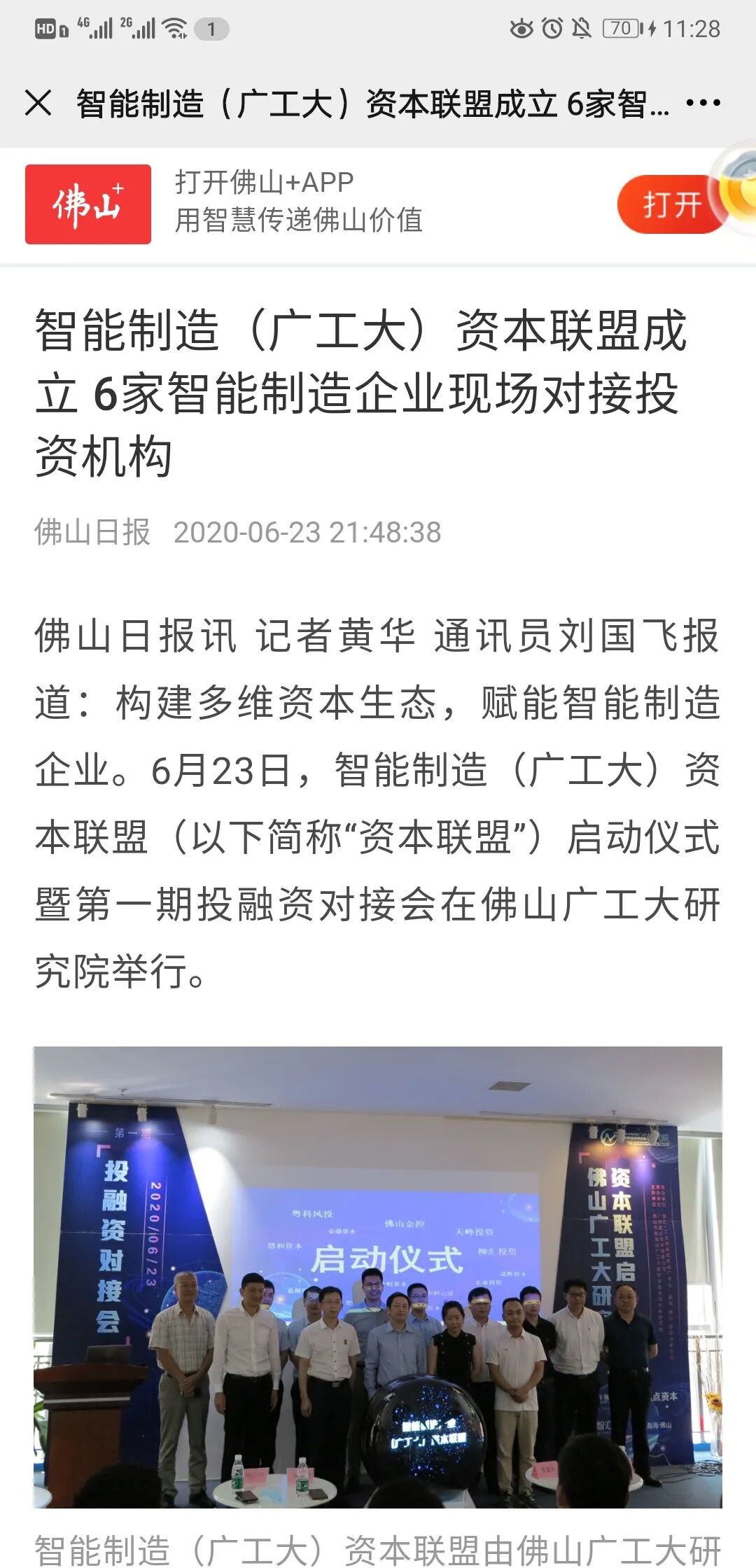 6月23日,智能制造(广工大)资本联盟启动仪式暨第一期投融资对接会在佛山广工大研究院顺利举行,标志着智能制造(广工大)资本联盟正式成立。活动由佛山广工大研究院主办,广州起点资本有限公司承办,智汇+工业创新成果推广平台、瀚海(佛山)国际创新中心协办,共有企业家、投资机构代表等50余人参加,智汇+平台全程进行了线上直播。活动吸引了南方日报、佛山日报、珠江时报等媒体关注报道!