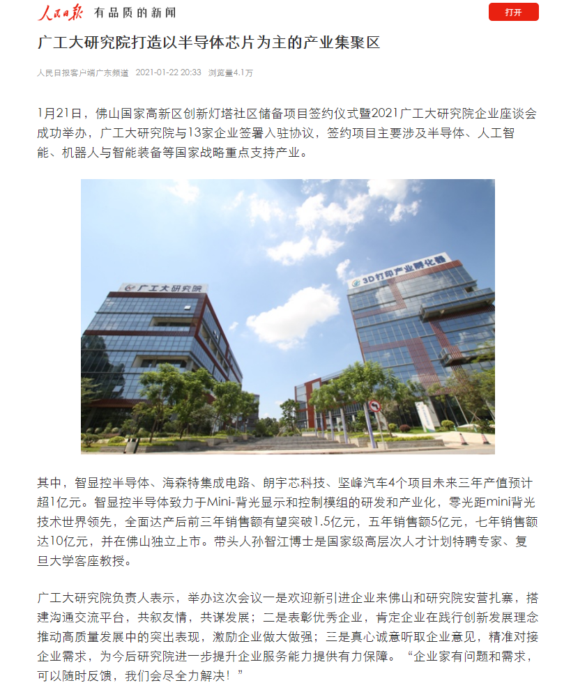 广工大研究院负责人表示,希望通过高端科技项目的引进,促进产业集聚、人才集聚,突破一批卡脖子技术,努力打造以半导体芯片为主的产业集聚区,为核心技术的国产化贡献新力量。目前,广工大研究院已引进20余家半导体领域企业,着力构建半导体产业生态,未来计划用3年时间汇聚50家上下游企业,实现佛山半导体芯片产业集聚发展。